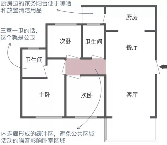 有的戶型兩個次臥門相對,單獨再內(nèi)縮出一個小門廳,配上次衛(wèi),相當便利。 而兩個次臥門直接朝向客廳的話,也同樣會存在公共區(qū)域活動的家人打擾臥室休息的情況。
