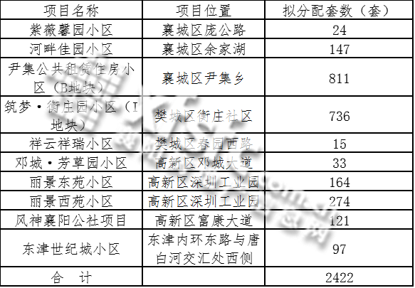 2017年11月底,市房管局全面啟動(dòng)第二批公租房分配工作,拿出2422套公租房,面向社會(huì)公開分配。這些公租房遍及全市,方便不同地區(qū)的住房困難家庭申請(qǐng)居住,其中“紫薇馨園”小區(qū)24套、“河畔佳園”小區(qū)147套、尹集公共租賃住房項(xiàng)目(B地塊)811套、“筑夢(mèng)·衡莊園”小區(qū)(I地塊)736套、“祥云祥瑞”小區(qū)15套、“鄧城·芳草園”小區(qū)33套、“麗景東苑”164套、“麗景西苑”274套、“風(fēng)神襄陽(yáng)公社”小區(qū)121套、“東津世紀(jì)城”公共租賃住房小區(qū)97套。