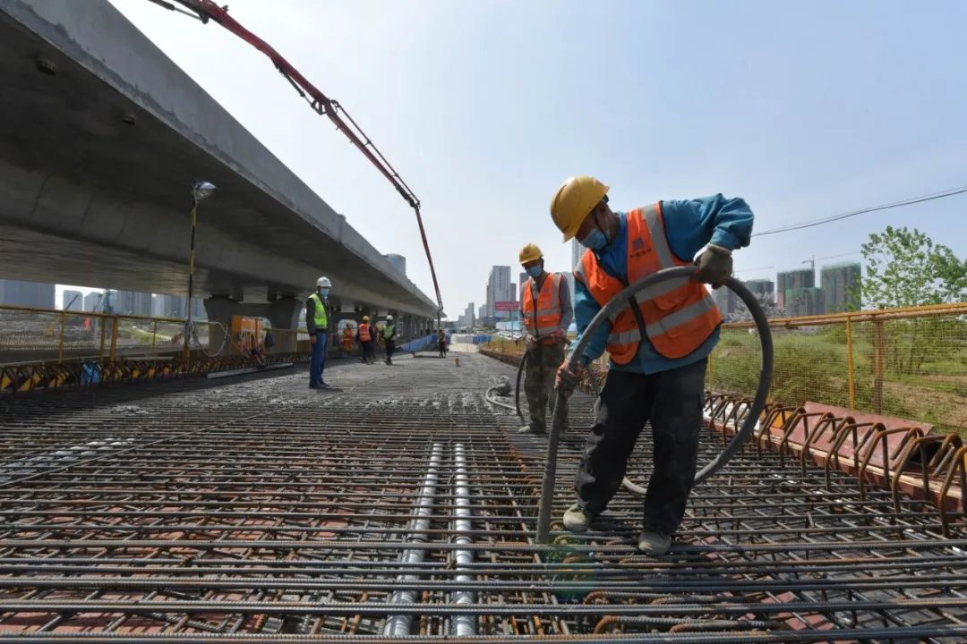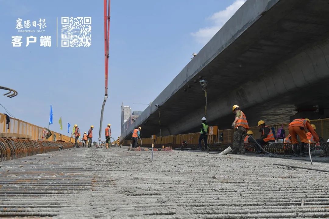 4月19日,在東西軸線樊城段,中建三局開始澆筑連接臥龍大道的下匝道。