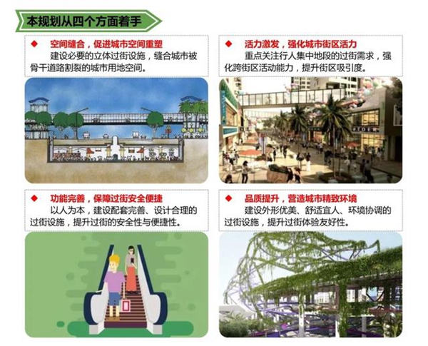 遠(yuǎn)期規(guī)劃為,2035年在現(xiàn)狀基礎(chǔ)上,再規(guī)劃新建人行天橋57座、人行地道11座,總共68座。