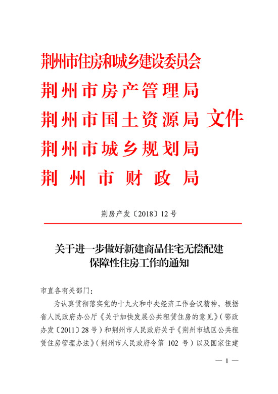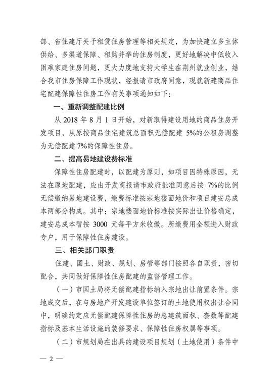 近日,荊州市住建委、市房管局等五部門聯(lián)合發(fā)布《通知》:今后,荊州新取得建設用地的商品房住房開發(fā)項目,從原按商品住宅建筑總面積無償配建5%的公租房,調整為無償配建7%的保障性住房。